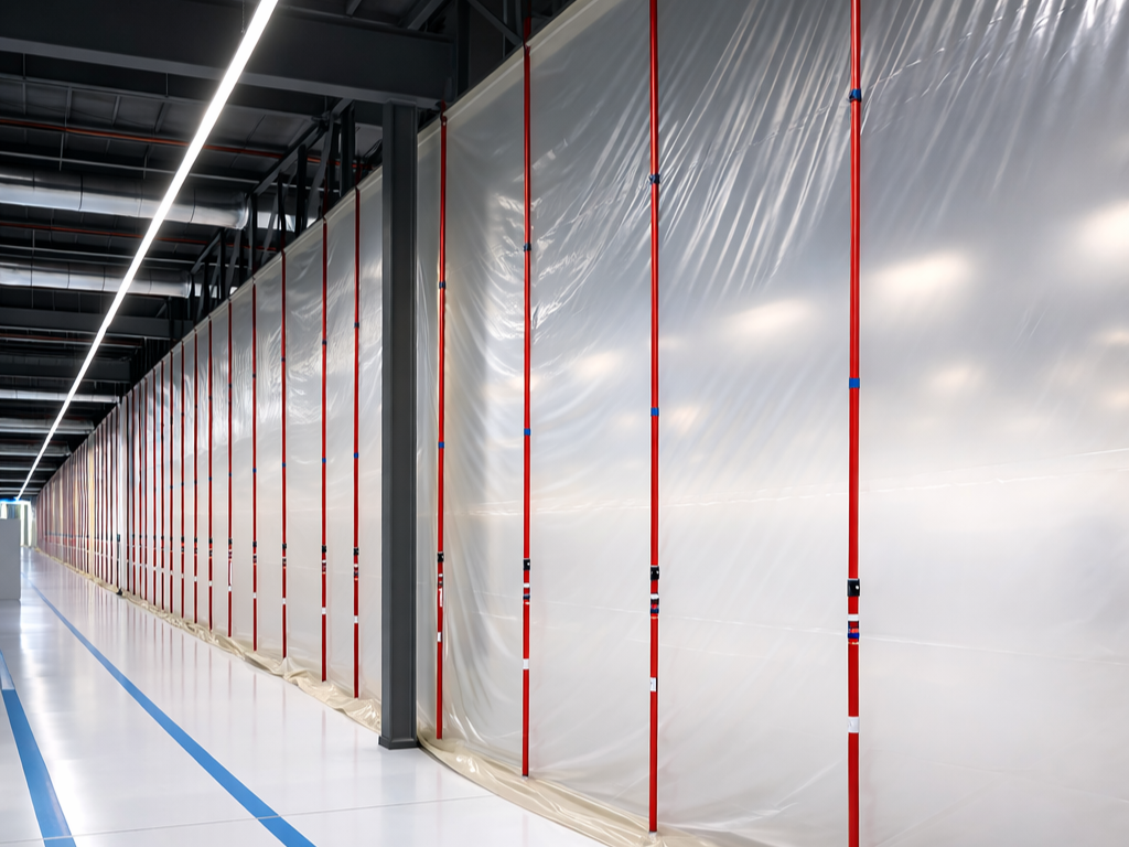 Med fjäderbelastade och vridlåsande aluminiumstänger bygger man upp till 6 meter höga dammskydd med plastfolie eller återanvändbara tygpaneler. In- och utgångar bygger man smidigt med blixtlås eller magnetiska dörrar.
